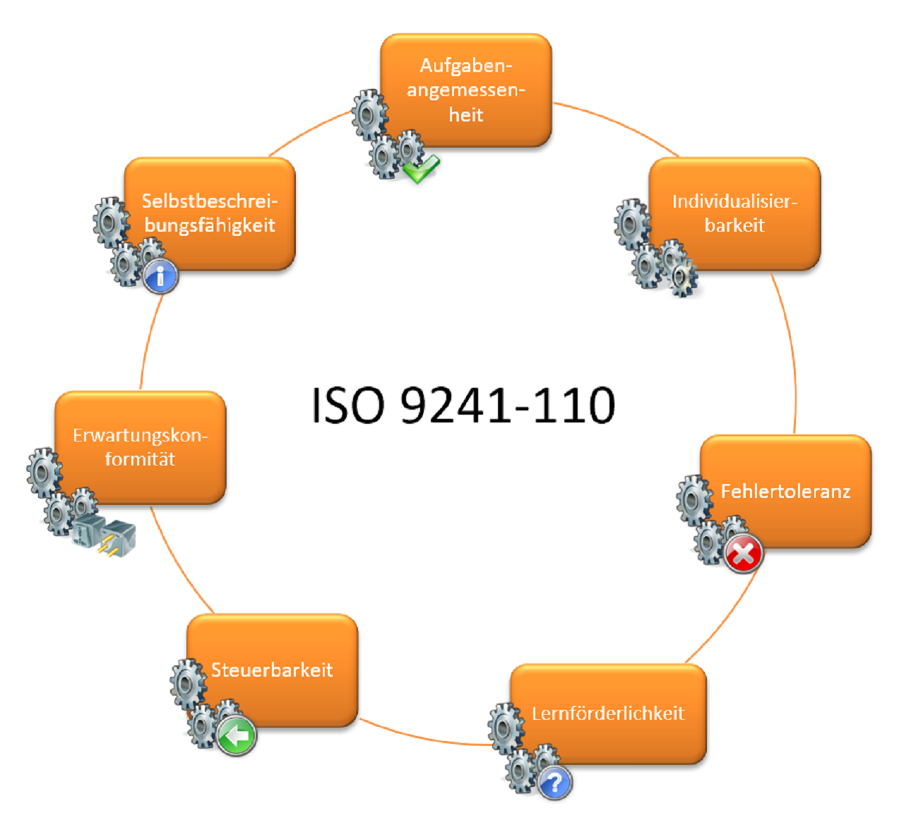 The seven aspects mentioned – also called dialogue principles – shed light on different criteria for software that play a particularly important role for the user and are intended to avoid “critical use situations”, i.e. points at which the application becomes difficult or even impossible for the user.