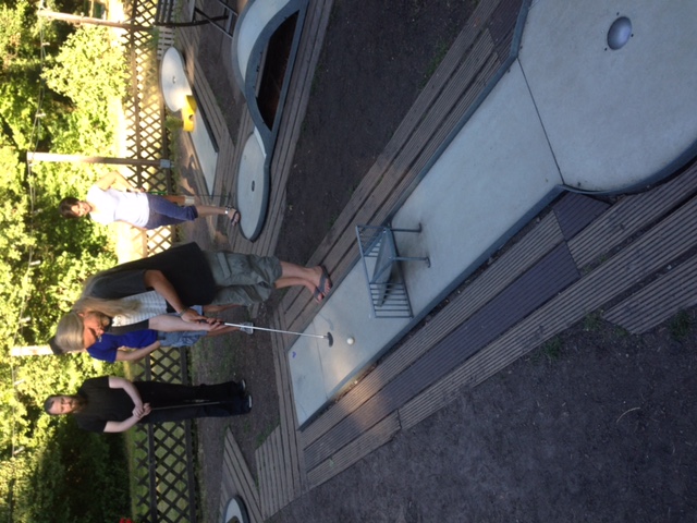 Nach dem Spaziergang in der heißen Mittagssonne war erstmal Abkühlung gefragt und so wurde bei einem kühlen Getränk in der Sonne entspannt. Nach der kleinen Erholungspause ging es dann zum nächsten Programmpunkt – Minigolf. In gelosten Teams wurde mit viel Freude Beraten, Behindert und der Abschlag geübt.